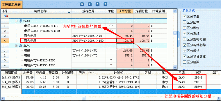 再结合工程量表的数据层次管理,让动力配电工程量的检查、核对、双方对量简单化,数据来源清晰、明确化,如下图: