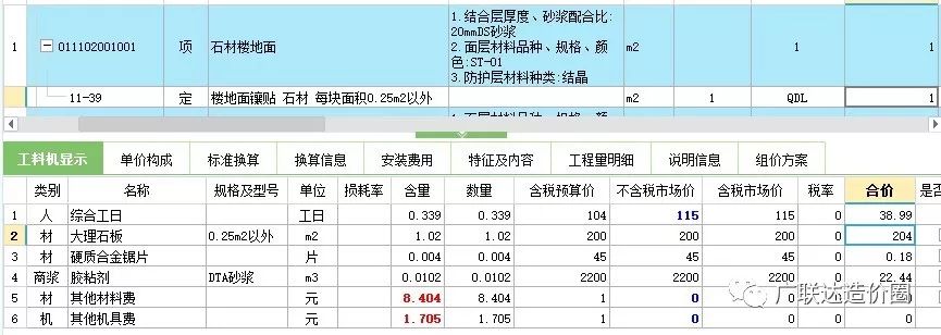 从定额人、材、机表中可以分析出来,北京2012预算定额块料铺装是不带找平层的;这与其他大部分地区不同,要实现这条清单项目的合理性,必须按下面截图套用定额: