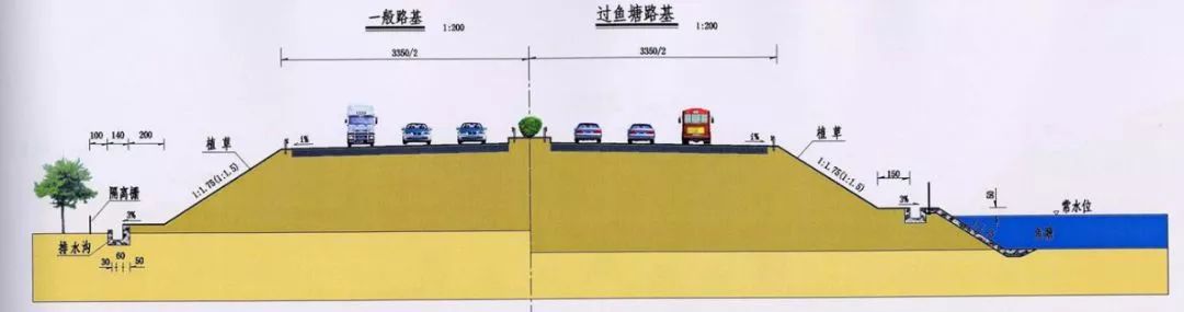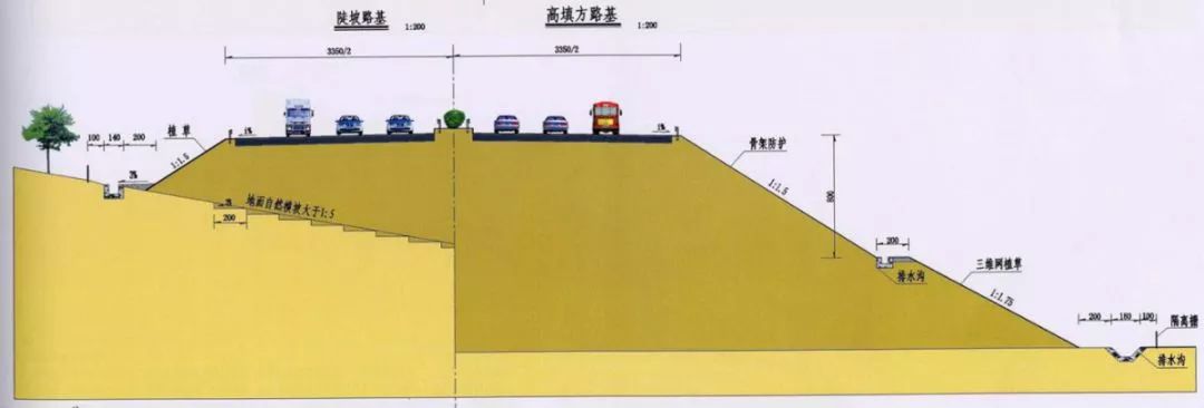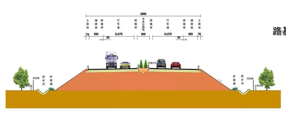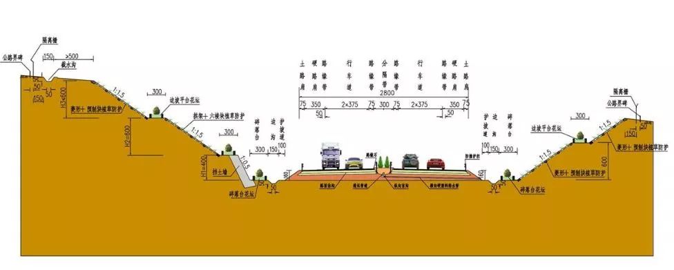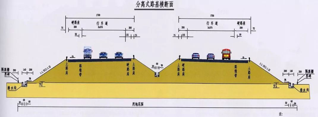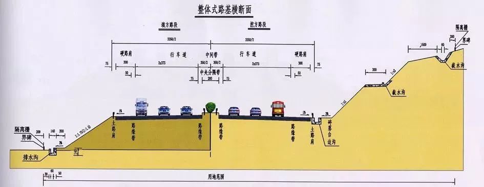 标准横断面图:表达行车道、路缘带、硬路肩、路面厚度、土路肩和中央分隔带等道路各组成部分的横向布置。