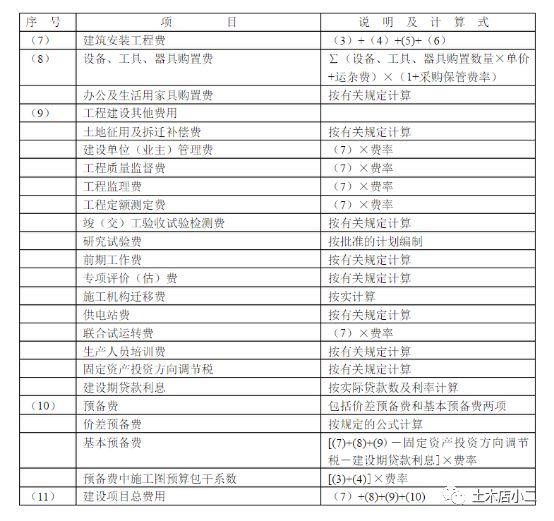 11)工程建设其他贵用:土地征用及拆迁补偿费、建设项目管理费用、研究试验费、前期工作费、专项评价(估)算、施工机构迁移费、供电贴费、联合试运转费、生产人员培训费、固定资产投资方向调节税、建设期贷款利息
