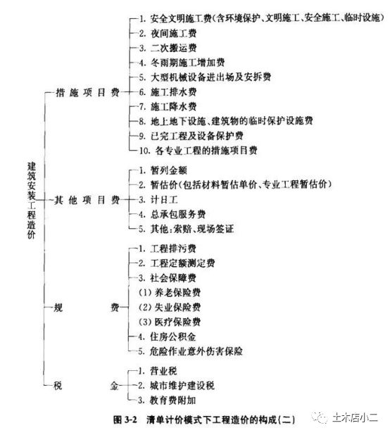 清单计价模式下的建安造价包括分部分项工程费、措施项目费、其他项目费、规费和税金,如图3-2所示。若从总投资来说则包含建筑安装工程费、设备、工具、器具及家具购置费、工程建设其他费用、预备金。