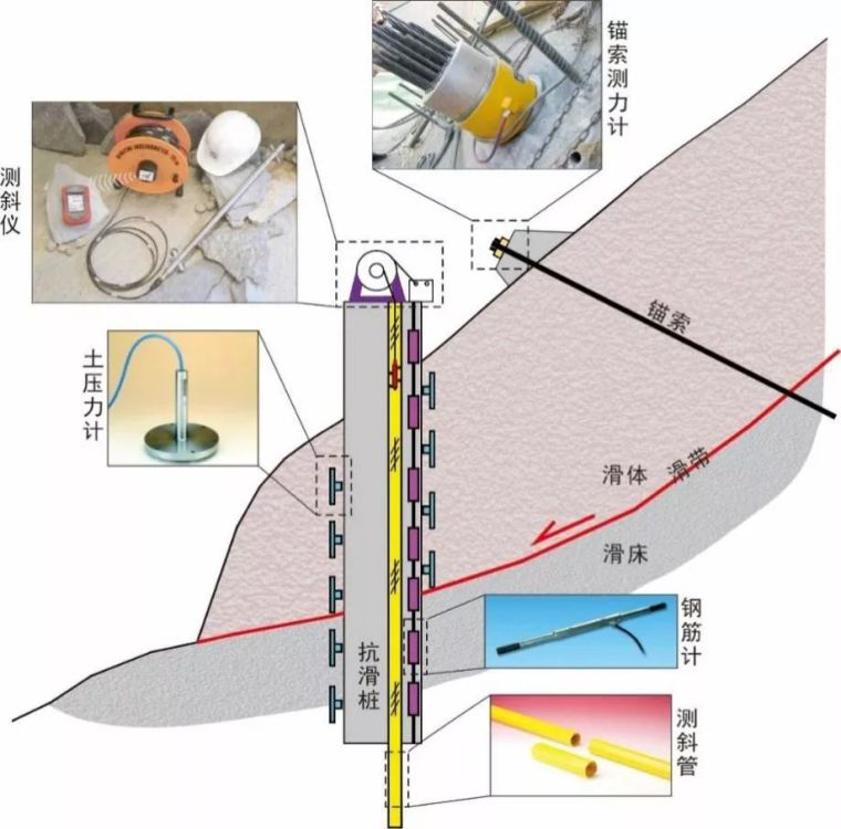 滑坡支护结构常用监测布置示意图(治理工程实施后)