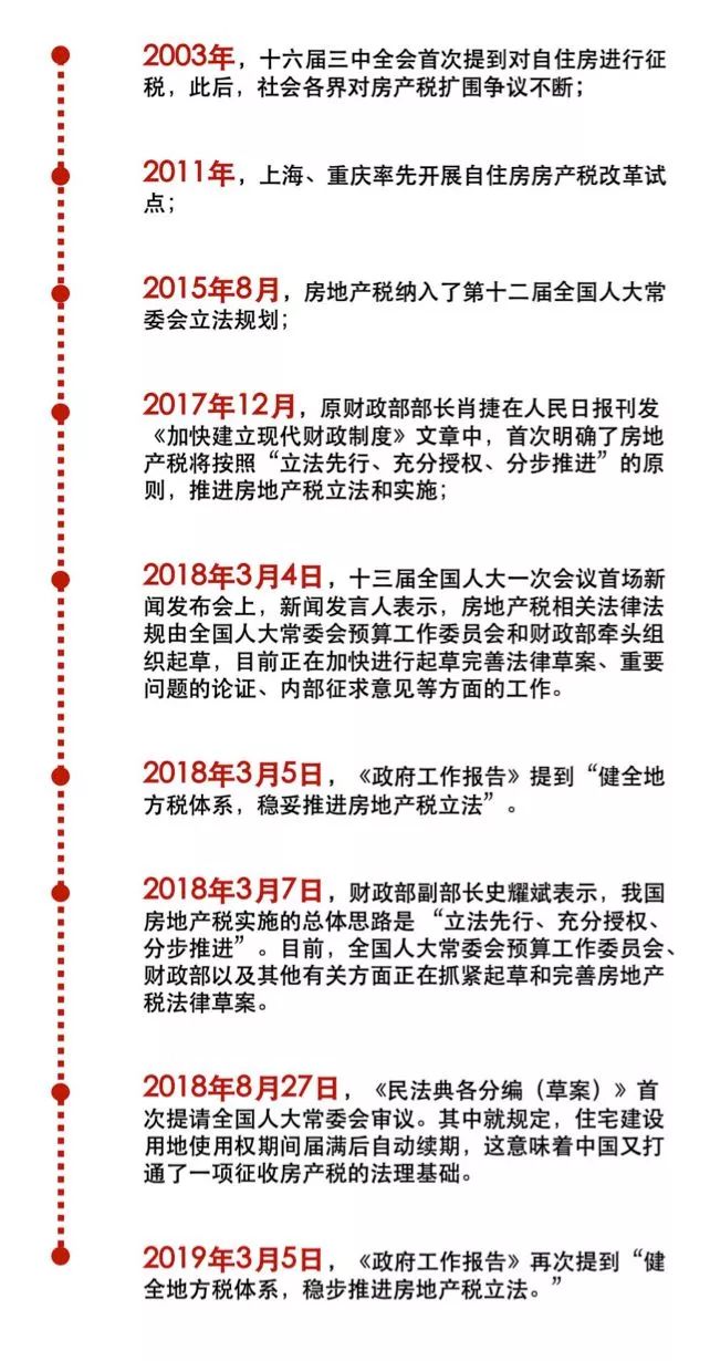 2018年3月,财政部有关负责人在十三届全国人大一次会议记者会上曾透露,全国人大常委会预算工委、财政部以及其他有关方面正在抓紧起草和完善房地产税法草案。当年9月7日,十三届全国人大常委会立法规划公布,包括各类立法项目116件,其中,房地产税法被列入条件比较成熟,十三届全国人大常委会任期内拟提请审议的第一类项目中。