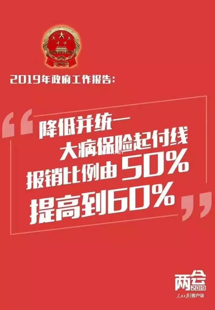 降低并统一大病保险起付线,报销比例由50%提高到60%,进一步减轻大病患者、困难群众医疗负担。做好常见慢性病防治,把高血压、糖尿病等门诊用药纳入医保报销。