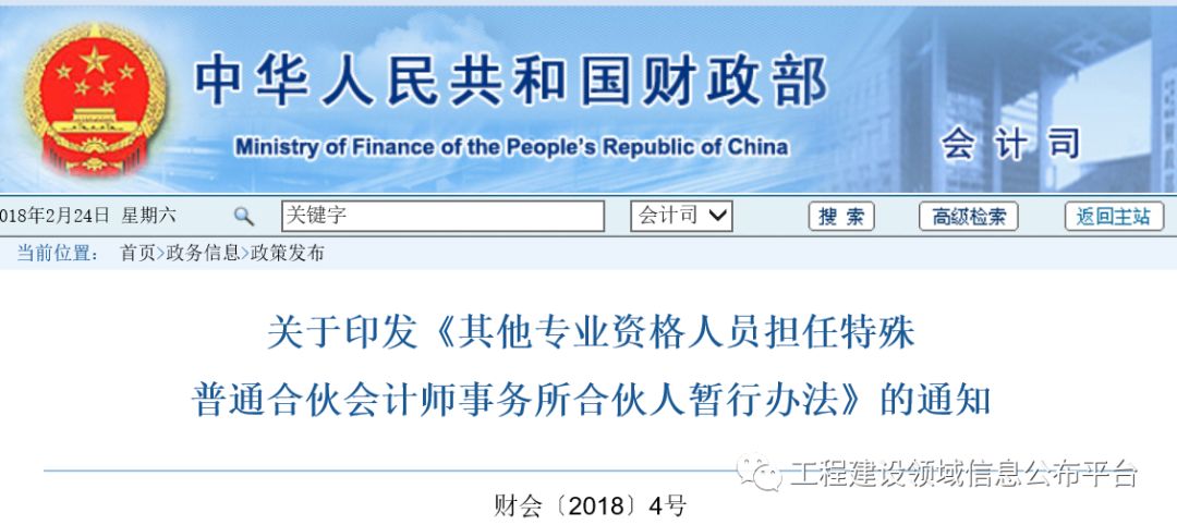2月23日,财政部印发《其他专业资格人员担任特殊普通合伙会计师事务所合伙人暂行办法》的通知(财会〔2018〕4号),规定具有中国资产评估师、中国税务师、中国造价工程师职业资格的人员,符合下列条件的,可以担任特殊普通合伙会计师事务所的合伙人,该通知在朋友圈中广泛传播。