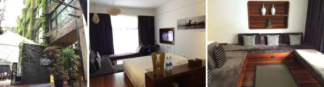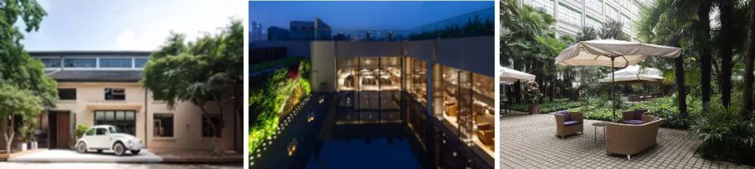 从左至右-杭州 31 间虚谷酒店入口、深圳回酒店顶层景观水池、意大利 NH 酒店中庭