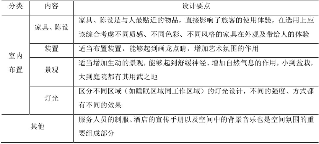 酒店的室内风格设计主要内容涉及家具、陈设、装置、景观、灯光等要素,还有服务人员的制服、酒店的宣传手册以及空间中的背景音乐也是设计的一部分,它们是在建筑空间基础上,对使用体验影响最为直接的要点,需要满足设计的实用性、整体性原则,同时最好具有自身的特点。
