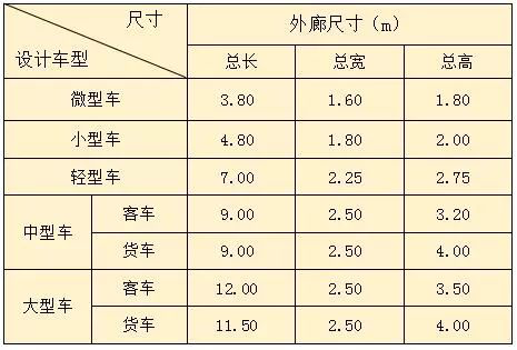机动车库应根据停放车辆的设计车型外廓尺寸进行设计。机动车设计车型的外廓尺寸可按下表取值。