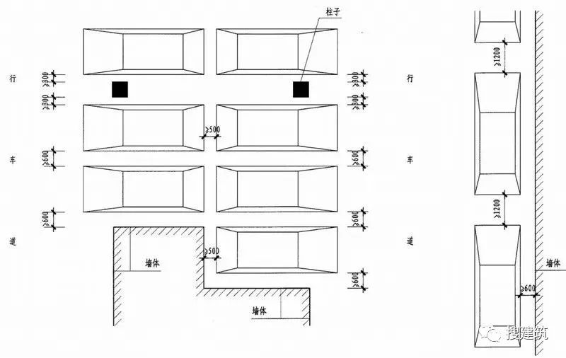 注:当墙、柱外有暖气片等突出物时,汽车与墙、柱之间的水平距离应从其凸出部分外缘算起。