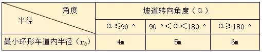 5.微型车和小型车的坡道转弯处的最小环形车道内半径(r0)不宜小于坡道转弯外最小环形车道内半径表的规定;其他车型的坡道转弯处的最小环形车道内半径应按机动车的环形车道最小内半径计算确定。