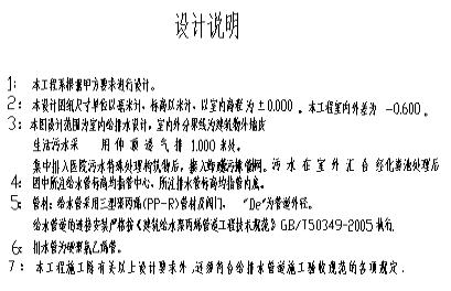 设计施工说明是有文字和数字组成的,主要阐述工程地理位置、工程概况、设计的依据(建设单位对功能要求,国家规范、行业规范等)、施工要求、设计参数、所选管材、管道连接方式、安装要求、压力要求、采用图集等,这部分必须仔细阅读,是图纸的总纲,直接关系着工程的造价高低。