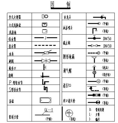 本例卫生间给排水安装工程图纸由设计施工说明、图例、施工平面布置图、立管系统图、局部放大图,安装详图等组成。为了简化,省去了局部放大图和卫生间详图。