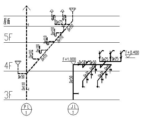 本例中排水系统PL1表示:每层有排水De50地漏2个、De110大便器4个、洗脸盆1个、拖布池1个、清扫口1个。