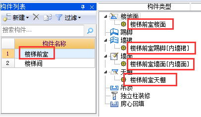 接下来在软件新建楼梯间、楼梯前室两个房间,然后给每个房间添加依附构件:楼面、踢脚、墙面、天棚装修。