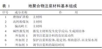 地聚合物是一类新型的高性能无机聚合物材料,属于碱激活胶凝材料,具有特殊的无机缩聚三维氧化物网络结构,地聚合物注浆材料的基本组成详见下表: