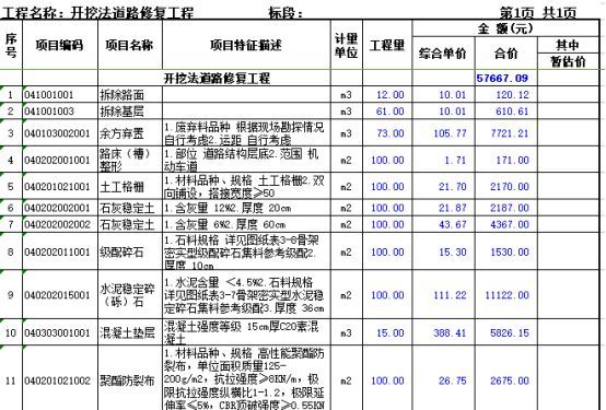 表1:100平米12cm厚沥青道路路面开挖修复单位工程汇总表