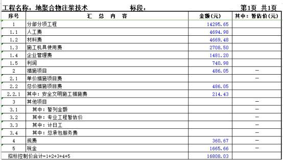 表3:100平米12cm厚沥青道路地聚合物注浆修复单位工程汇总表