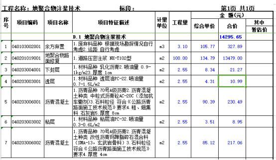 表4:100平米12cm厚沥青道路地聚合物注浆修复分部分项工程清单与计价表