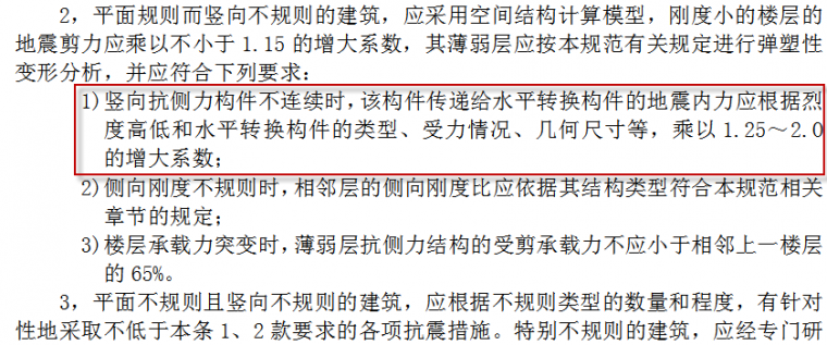 异形柱规程3.2.5的第四条要求,对于不规则的异形柱结构,其抗震设计应符合对于竖向抗侧力构件不连续时,构件传递水平转换构件的地震内力应根据不同条件和情况乘以1.25~1.5的放大系数。