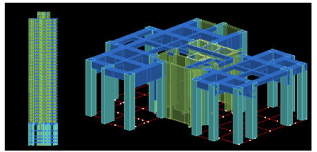 某7度半的框支转换结构,高度大于60m,该结构的转换层在第五层,非底部加强区的剪力墙的抗震等级为二级,框支框架的抗震等级为一级。如下图8为该工程的3D图及第五层转换层的梁、柱及墙体布置情况。