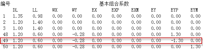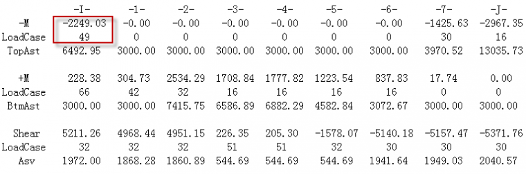 针对该框支转换梁进行手工校核,从图12框支梁结果可知,该梁I端对应组合号为49,该组合的具体构成情况如下图13所示: