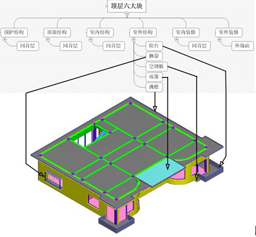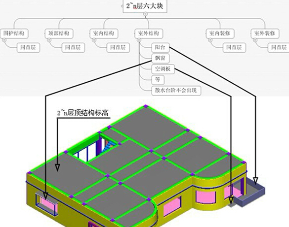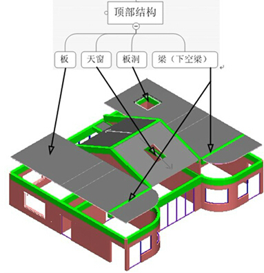 (五)顶层包含哪些构件顶层在建筑物里可能出现多次,但遵循的原则是一致的,其中围护结构、顶部结构、室内结构、室内装修同首层,室外结构通常会出现挑檐和雨篷,室外装修通常不会有外墙裙出现: