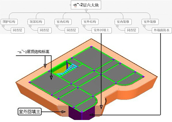 (二)-n~-2层包含哪些构件-n~-2层全部埋在地下,属于全地下室,其中围护结构、顶部结构、室内结构、室内装修所包含的构件同首层,室外结构变成了回填土,我们在基础层已经统计过了,室外装修变成了外墙防水: