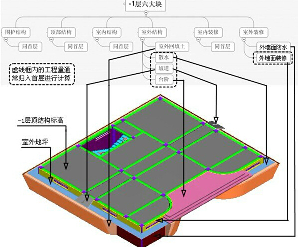 -1 层属于半地下室,部分埋在地下,部分埋在地上,其中围护结构、顶部结构、室内结构、室内装修所包含的构件同首层,室外结构里的回填土在基础层里已经统计过 了,室外结构里的散水、台阶、坡道从标高角度讲应该归-1层所有,但是图纸一般将这些构件都画在首层,所以散水、台阶、坡道通常都归入首层计算。-1层的室外装修这里变成了两部分,其中埋入地下部分变成了室外装修,露出地面部分属于外墙装修,一般也归入首层计算: