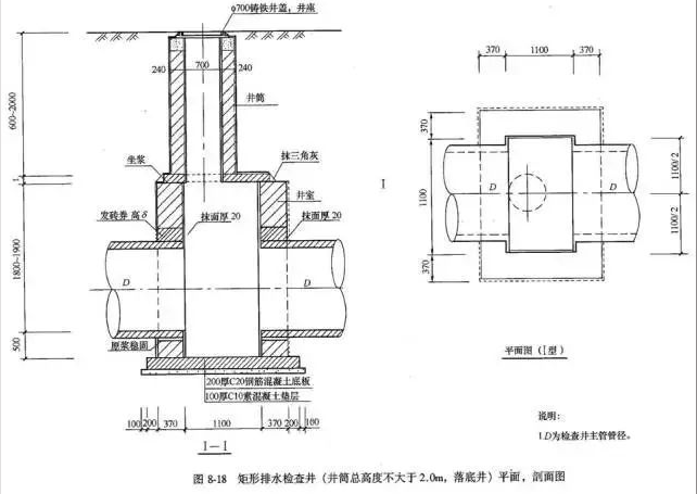 井室直径不小于1m,井筒直径不小于0.7m。井室与井筒间以渐缩部连接。也可在井室上加钢筋混凝土盖板,在盖板上砌筑井筒。