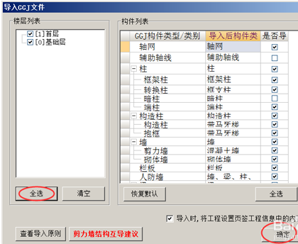 在导入文件中我根据自己需要选择要导入的内容;如果是新建的土建算量工程,那么直接点击全选然后点击确定。