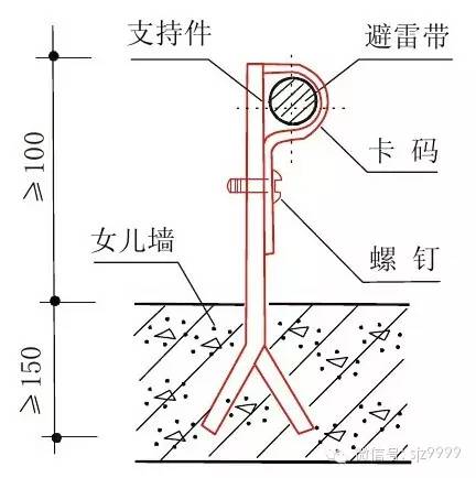 (3)外露的避雷带应采用热镀锌的专门夹式支持码支持,避免支持件与避雷带焊接(如图示)。