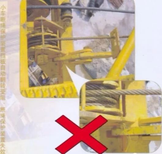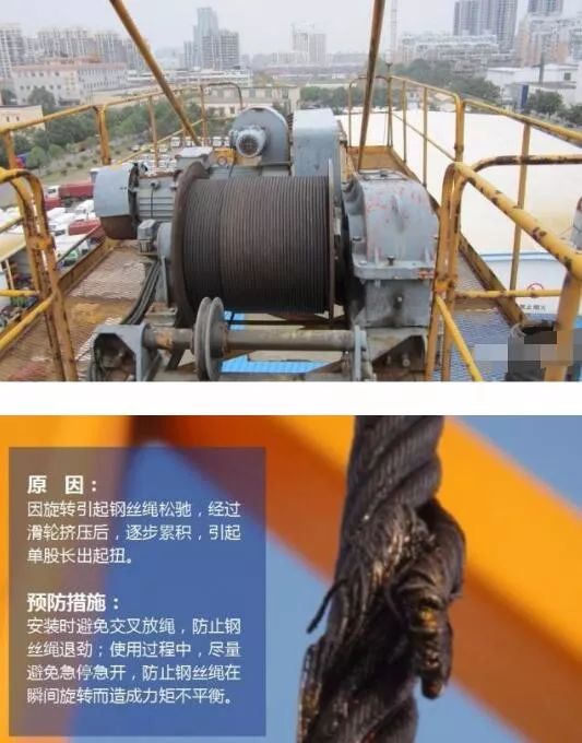c、钢丝绳失去正常的形状,产生畸形,如波浪、笼状畸变、绳股挤出、钢丝挤出、绳径局部变大、扭结、绳径局部变小、部分被压扁、弯折。