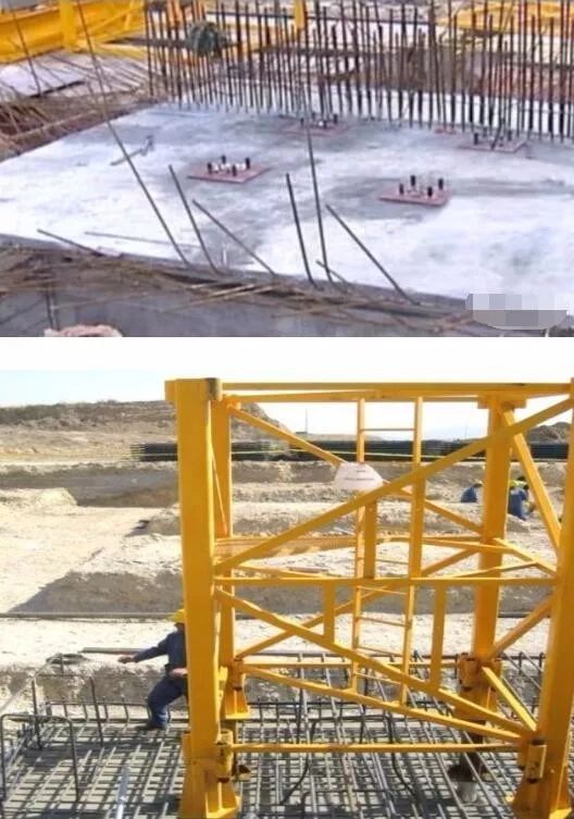 做塔吊基础的时候,一定要确保地耐力符合设计要求,钢筋混凝土的强度至少达到设计值的90%。