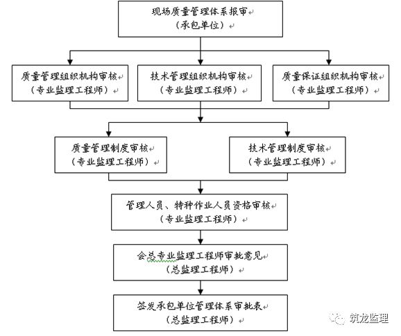 ⑴ 参加设计交底、审查施工组织设计;审查承包单位现场管理体系、审查分包单位资格、测量放线控制成果等程序细化。