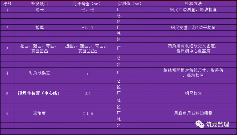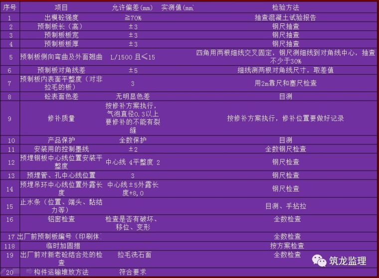 1.9、对PC构件出厂前进行外观检验,填写PC出厂前产品检测表。对合格的PC构件盖监理验收合格专用章,验收人签认。