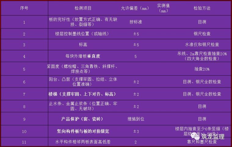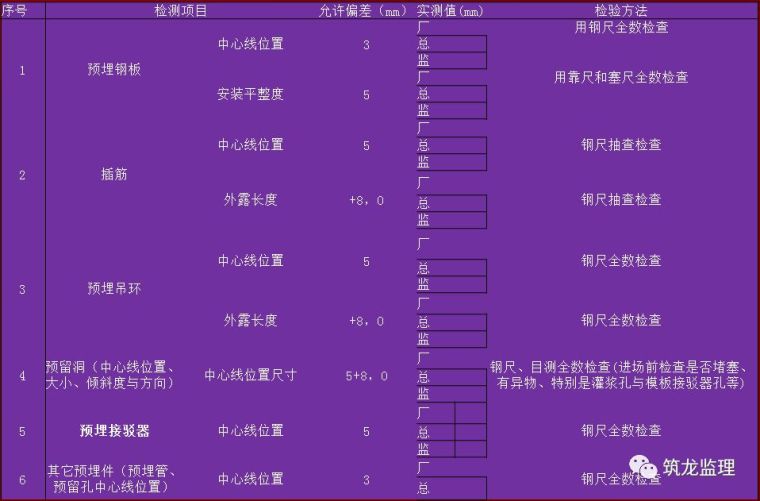 四、预制构件安装尺寸允许偏差应符合表的规定。检查数量:全数检查。检验方法: 观察, 钢尺检查