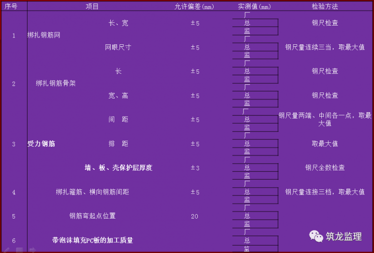 1.6、对钢筋加工和骨架的绑扎进行验收,预埋件、预留孔、吊点、接驳器、门框等进行隐蔽工程验收,并留有隐蔽影像资料,对验收合格的给予签认。并填写钢筋入模检测记录、预埋件和孔洞检测表、门窗框入模检测表。