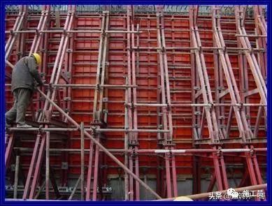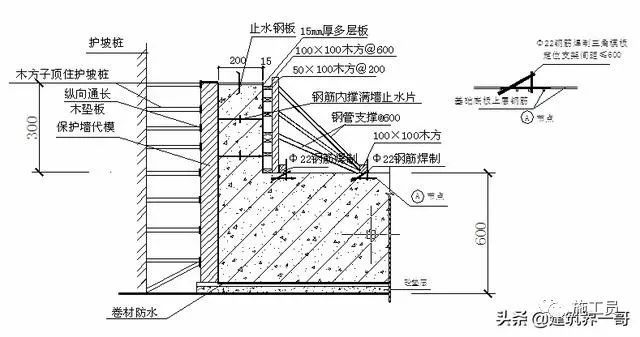 筏板上翻外梁墙基础模板,一般采用12mm-15mm厚木(竹)低档次多层板事先拼装而成,外帮木方作横竖背楞,水平向间距30~40cm,竖楞间距100~150cm;当上翻梁墙模高50 cm时,按施工方案要求设置拉模杆,拉模杆上焊接40止水环;底部每隔100~150cm设置一道托模杆,托模杆由钢筋下脚料制作而成;竖向采用48短钢管或25钢筋作锁模架,间距120~150cm;外导墙按设计要求设置300宽止水钢板或止水槽等。