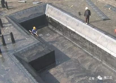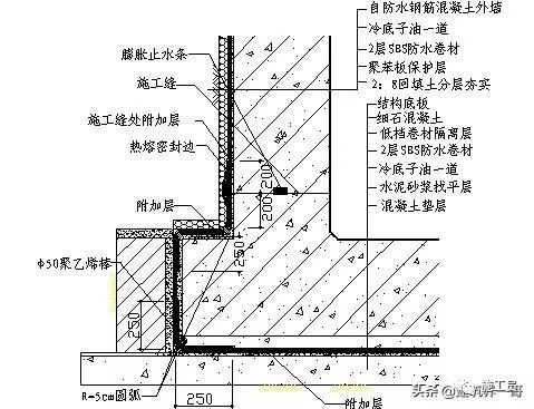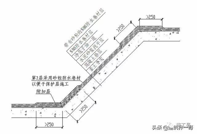 电梯井、集水坑基层阴阳角必须做成50 mm的圆弧或45。(135。)八字角,阴阳角、立面内角、外角及施工缝处均做500 mm宽的附加层。电梯井、集水坑斜面的第二层防水卷材采用带有砂粒的,以便于防水保护层的施工。
