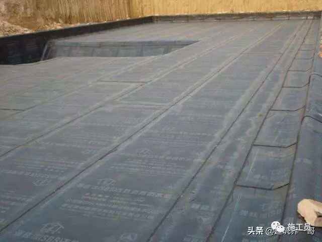 底板垫层混凝土平面部位的卷材宜采用空铺法或点粘法,其他与混凝土结构相接触的部位应采用满粘法;卷材接缝必须粘贴严密,接缝口宽度不应小于10mm;在里面与平面的转角处,卷材的接缝应留在平面上,距立面不应小于600mm;阴阳角处找平层应做成圆弧或45。(135。)角,并应增加1层相同的卷材,宽度不宜小于500mm;防水基层必须平整、牢固,铺贴卷材前应使基层表面干燥,基层含水率小于9%,新作业面施工前先用简易法测基层含水率,即用1m2的卷材覆盖4h后察看凝结水情况,若无凝结水即可进行卷材的铺贴。