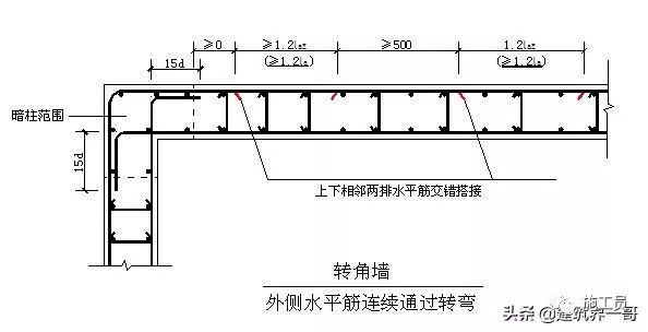 斜交墙端部水平钢筋应伸至对边且有15d直拐,施工中注意控制水平钢筋应伸直至对边竖筋内侧,转角墙外侧水平筋应连续通过转弯。