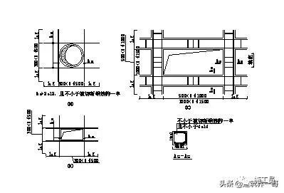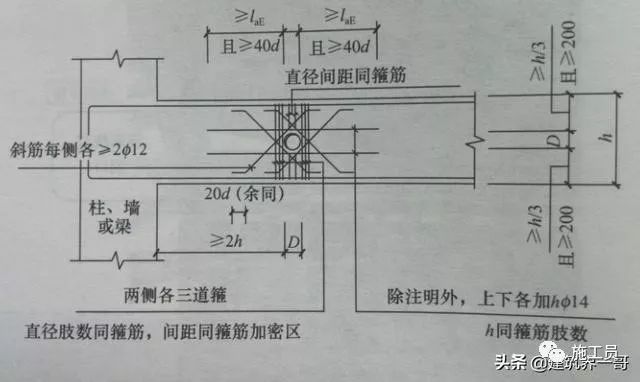 当在基础承台梁上开洞时洞口尺寸Dh/5,连续开洞净距4D;当在框架梁上开洞时洞口尺寸Dh/5,且150mm,连续开洞3D。