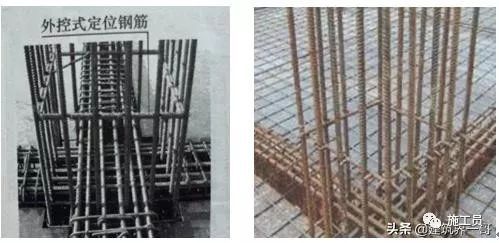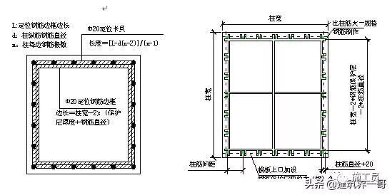 框架柱模板上口设置定位箍筋框,用于控制钢筋位移,定位箍分内控式和外控式两种,置于柱顶的定位箍可周转使用。
