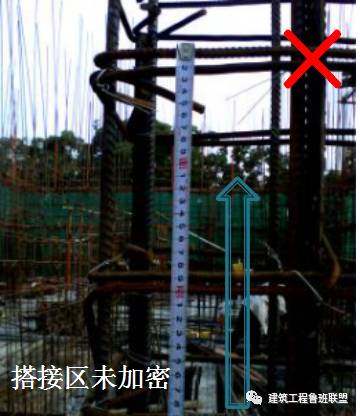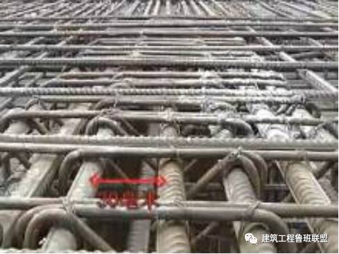 3)墙柱竖筋搭接要求:长度满足设计及规范,搭接处保证有三根水平筋。绑扎范围不少于三个扣。墙柱立筋50%错开,其错开距离不小于相邻接头中中1.3倍搭接长度。搭接区加密。