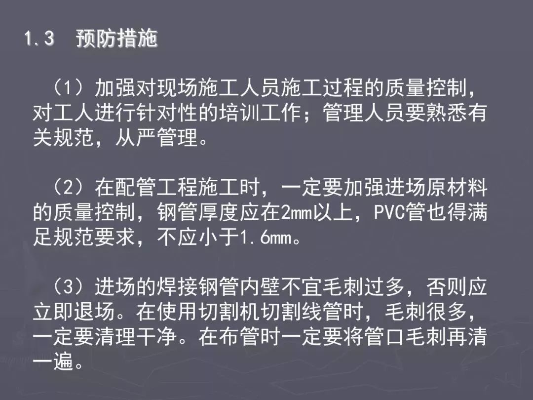 (1)加强对现场施工人员施工过程的质量控制,对工人进行针对性的培训工作;管理人员要熟悉有关规范,从严管理。