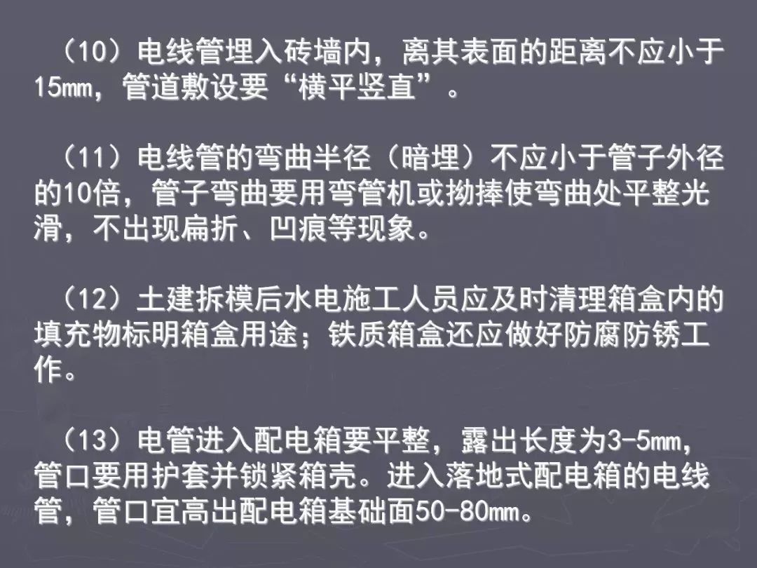 (5)电线管的弯曲半径(暗埋)不应小于管子外径的10倍,管子弯曲要用弯管机或拗捧使弯曲处平整光滑,不出现扁折、凹痕等现象。