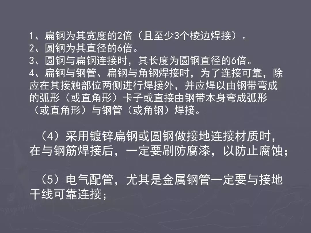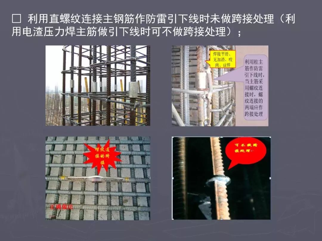 (3)根据GB501692《电气装置安装工程接地装置施工及验收规范》规定,避雷引下线的连接为搭接焊接,搭接长度为圆钢直径的6倍,因此,不允许用螺纹钢代替圆钢作搭接钢筋。另外,作为引下线的主钢筋土建如是对头碰焊的,应在碰焊处按规定补一搭接圆钢。