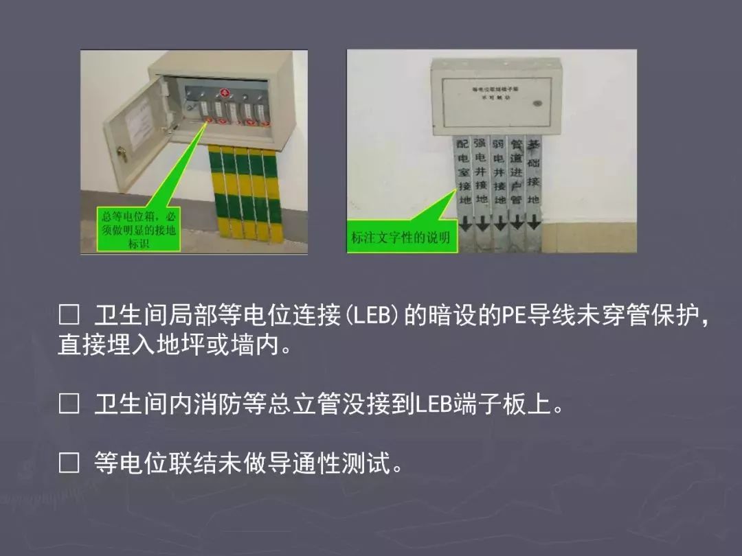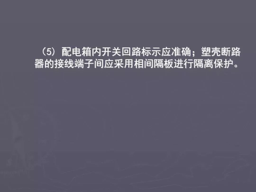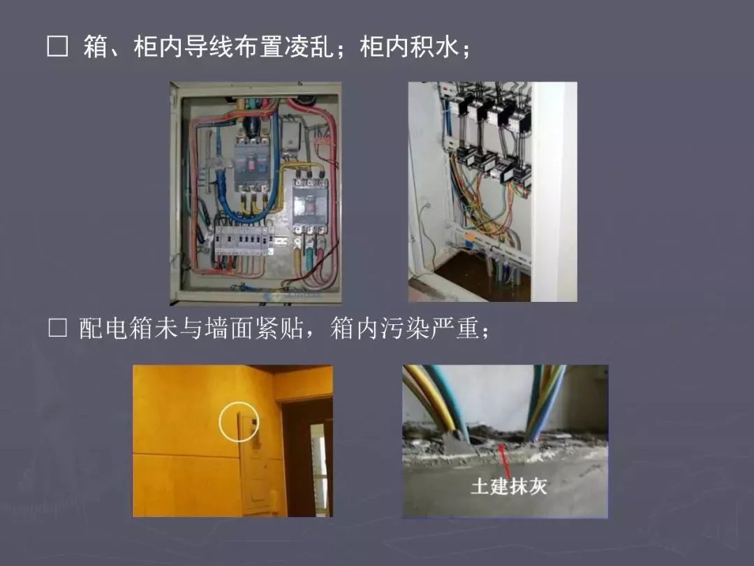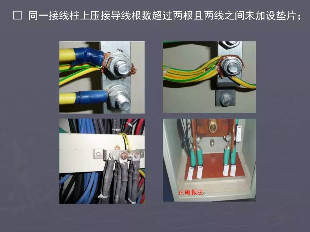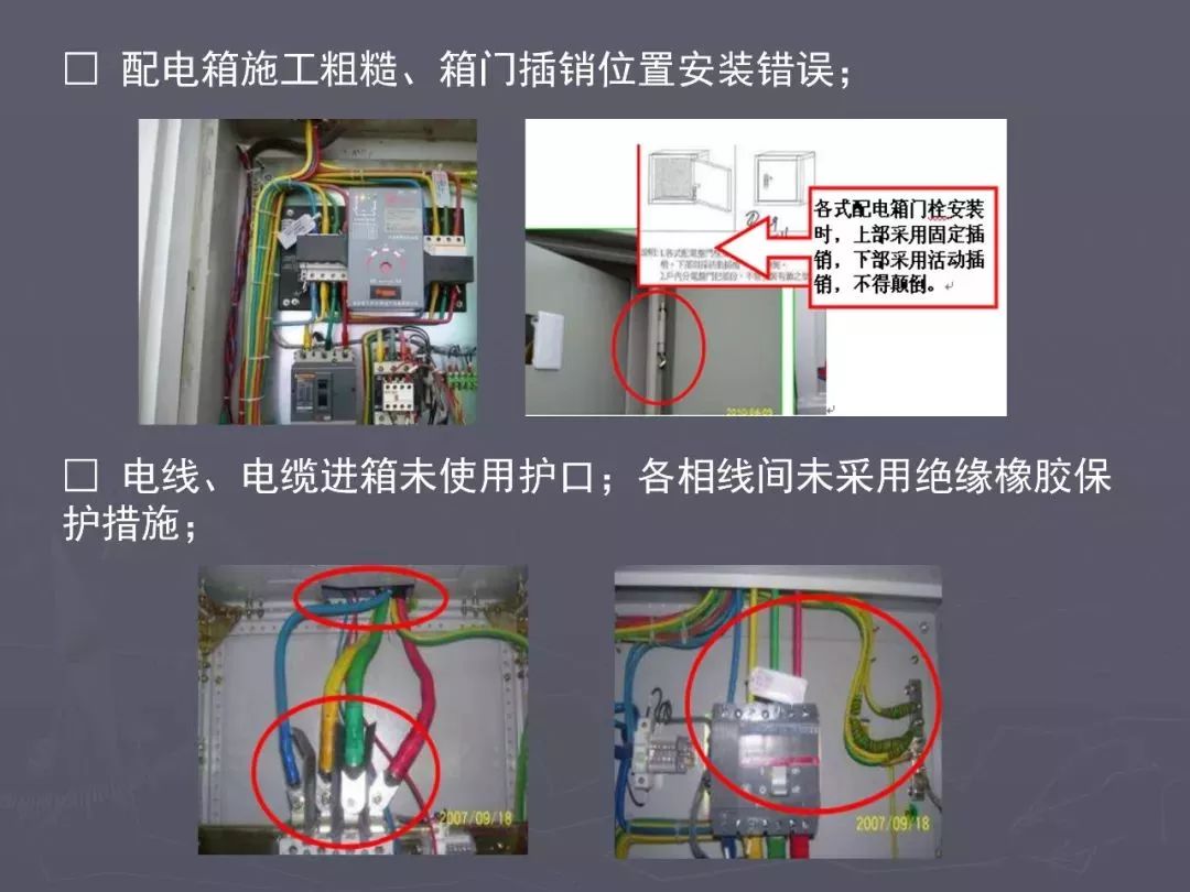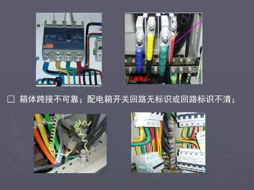 (4)落地的动力箱接地不明显(做在箱底下,不易发现),重复接地导线截面不够。箱体内线头裸露,布线不整齐,导线不留余量。