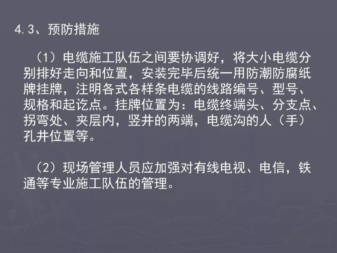 (1)电缆施工队伍之间要协调好,将大小电缆分别排好走向和位置,安装完毕后统一用防潮防腐纸牌挂牌,注明各式各样条电缆的线路编号、型号、规格和起讫点。挂牌位置为:电缆终端头、拐弯处世哲学、夹层内,竖井的两端,电缆沟的人手工艺孔等。