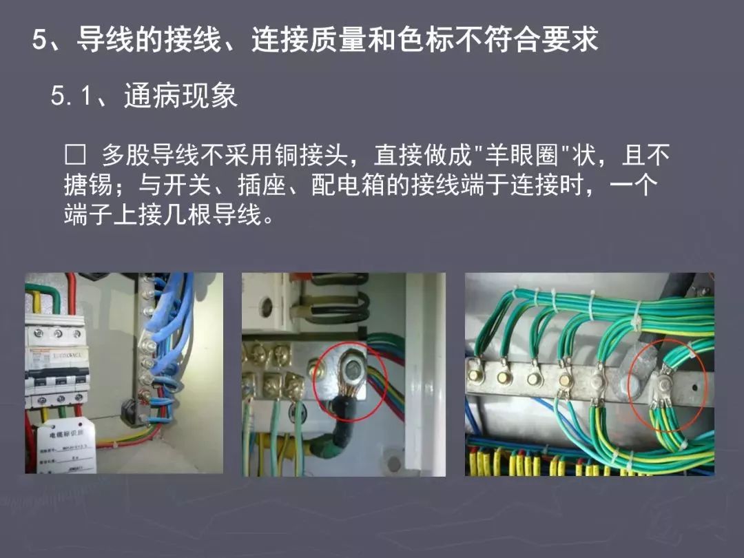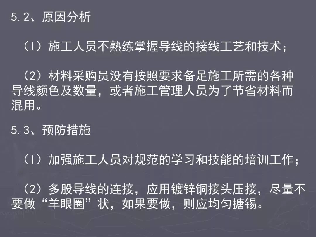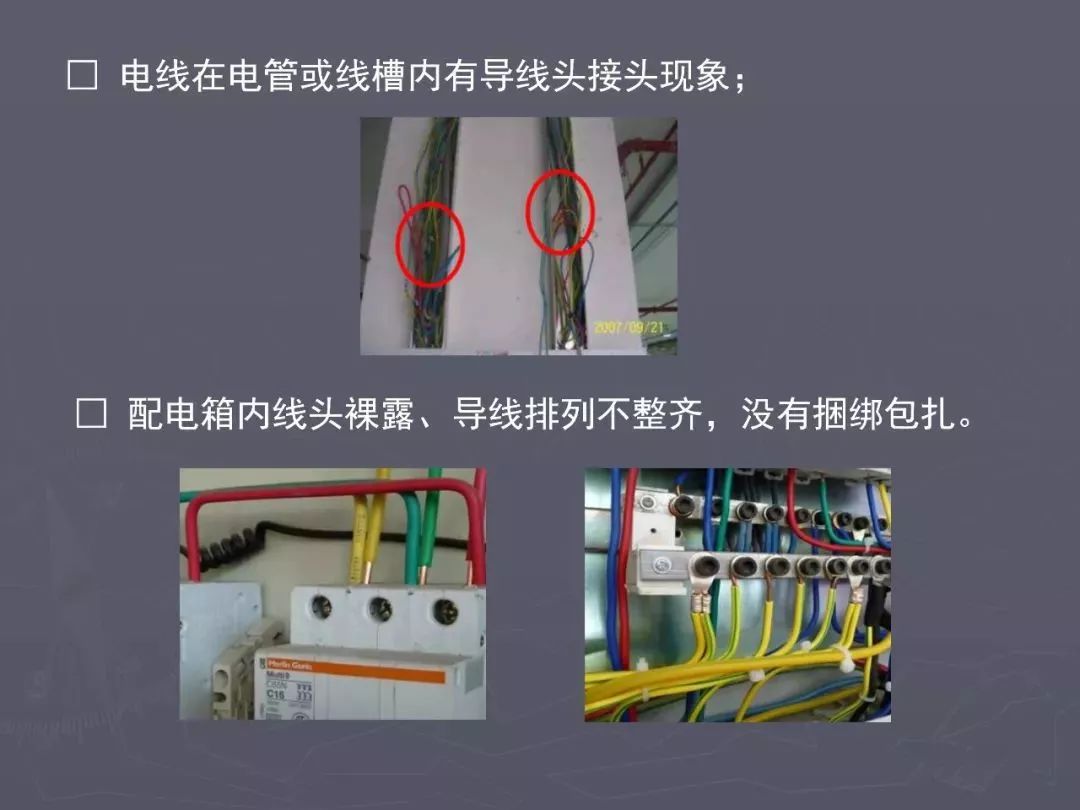 (2)材料采购员没有按照要求备足施工所需的各种导线颜色及数量,或者施工管理人员为了节省材料而混用。